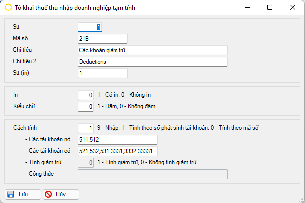 Nếu khai báo chỉ lấy phát sinh nợ, hoặc chỉ phát sinh có thì chương trình sẽ cho phép khai báo có tính giảm trừ hay không. Điều này phụ thuộc vào tham số "Tài khoản xác định kết quả kinh doanh".