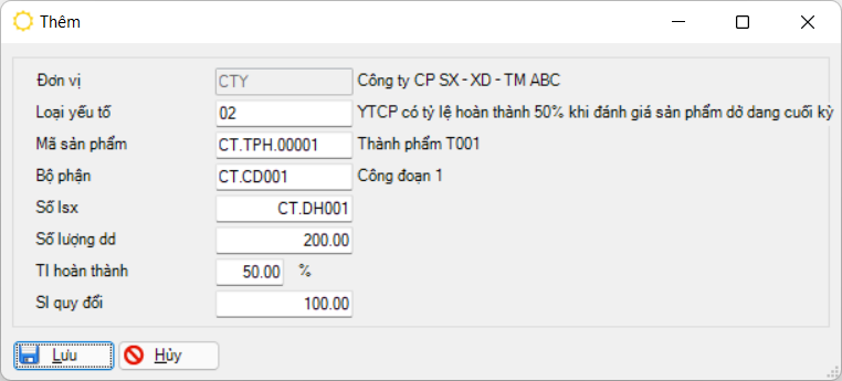 Tỷ lệ hoàn thành của sản phẩm dở dang cuối kỳ. Nếu dở dang tỷ lệ là 50% thì nhập TL hoàn thành là 50.