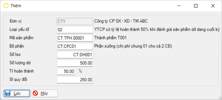 Tỷ lệ hoàn thành của sản phẩm dở dang đầu kỳ. Nếu tỷ lệ dở dang là 50% thì nhập TL hoàn thành là 50.