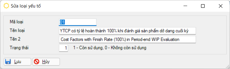 Đường dẫn: Giá thành → Danh mục khác → Danh mục loại yếu tố