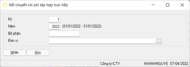 Đường dẫn: Giá thành → Tính giá thành sản phẩm → Kết chuyển chi phí tập hợp trực tiếp