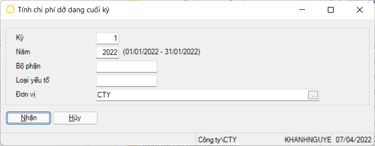 Menu này dùng để tính chi phí dở dang cuối kỳ của các yếu tố chi phí.