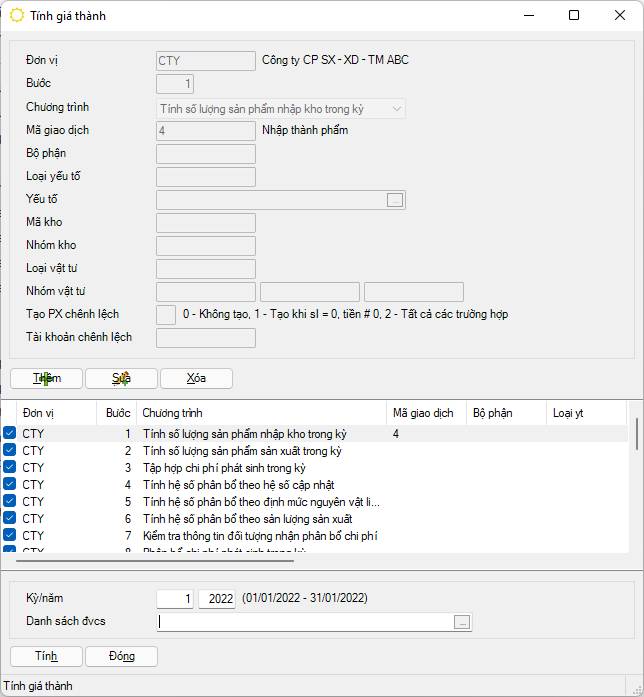 Đây là tiện ích tổng hợp, chương trình sẽ tự động tính từ đầu đến cuối, không cần phải tính riêng từng bước như trình bày trong phần tính giá thành trên đây. Việc tính từng bước chỉ nhằm mục đích kiểm tra sự đúng đắn của việc cấu hình bài toán tính giá thành, khi đã bảo đảm chính xác, thì mới sử dụng tiện ích này.