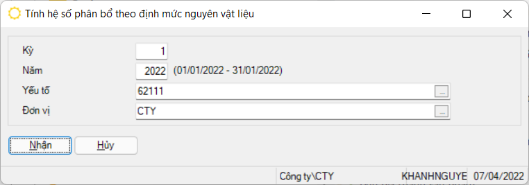 Đường dẫn: Giá thành → Tính giá thành sản phẩm → Tính hệ số phân bổ theo định mức nguyên vật liệu