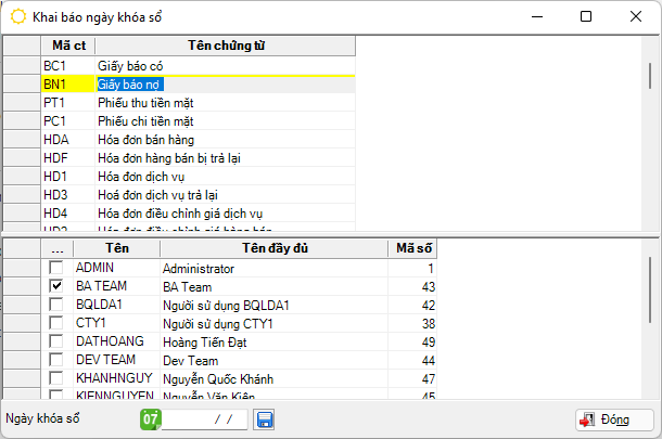 Đường dẫn: Hệ thống → Bảo trì số liệu → Khoá số liệu theo chứng từ