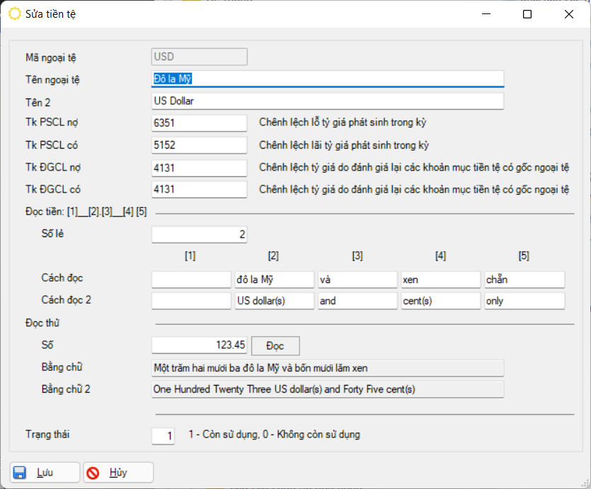 khi in 123.45 USD, chương trình sẽ hiển thị bằng chữ: “Một trăm hai mươi ba đô la và bốn mươi lăm cen”
