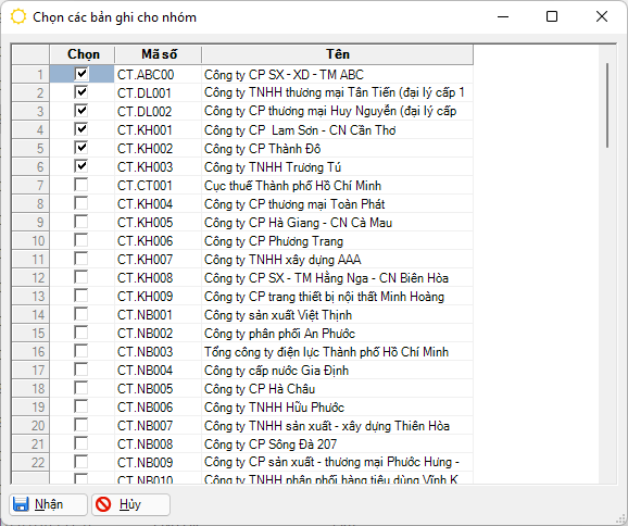 Sau khi thêm 1 nhóm, lưu lại thì chương trình sẽ mở thêm 1 màn hình như sau để chọn mã khách hàng sẽ lên trong báo cáo này.