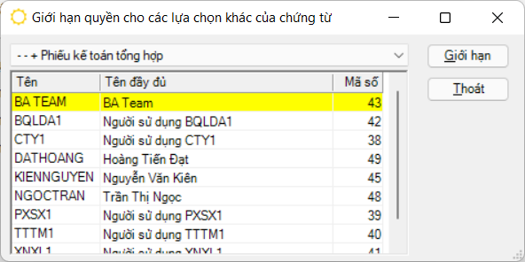 Đường dẫn: Hệ thống → Người sử dụng → Giới hạn quyền truy nhập các lựa chọn khác của chứng từ