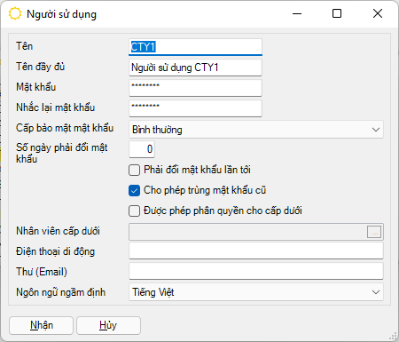 Nếu chọn là “Có” thì khi truy nhập vào chương trình lần đầu, chương trình sẽ yêu cầu đổi mật khẩu.