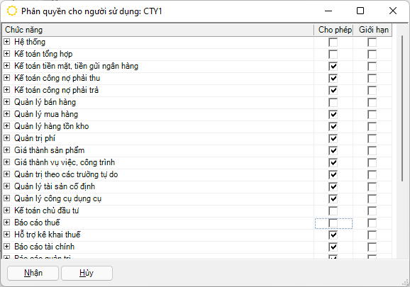 Ngoài ra chương trình cho phép phân quyền cho từng người sử dụng đến từng chức năng (menu) của chương trình. Đối với phần nhập liệu, chương trình cho phép phân quyền được hiệu chỉnh các chứng từ đã lưu hoặc được tham gia xử lý trong các quy trình hay không.