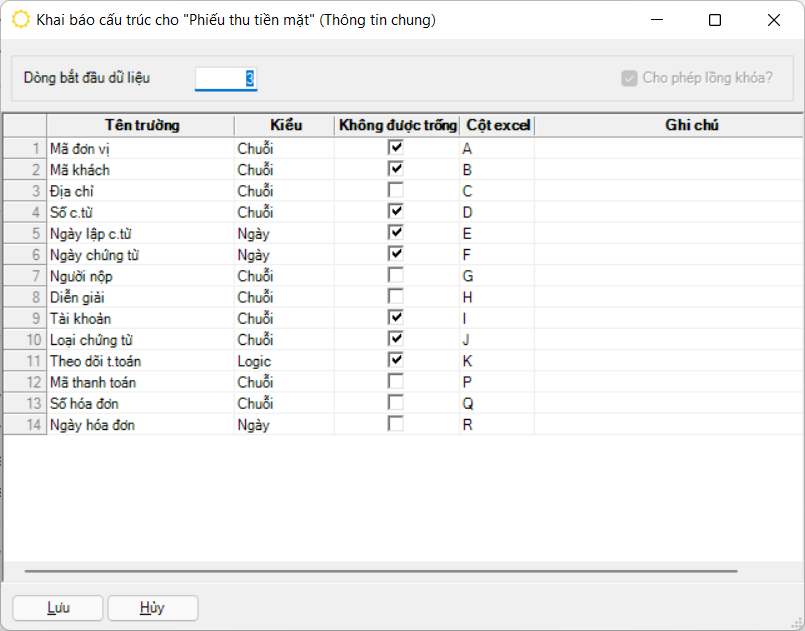 - Sẽ có một số trường sẽ vừa có trong danh sách phần chung và phần chi tiết, để đơn giản, người dùng vẫn cứ khai báo vào một cột nào đó của bảng tính. Ví dụ: Ngày chứng từ vừa có trong chi tiết vừa có trong phần chung, ta sẽ khai báo cả 2 nơi cùng chung cột E.