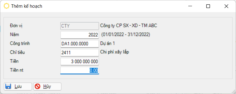 Để hỗ trợ các báo cáo so sánh kế hoạch, phải nhập số kế hoạch thực hiện của hạng mục công trình vào một màn hình riêng. Người sử dụng phải cập nhật kế hoạch thực hiện vào đầu mỗi năm.