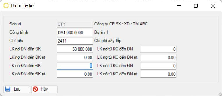 Ngoài việc cập nhật số dư đầu kỳ cho các hạng mục công trình, phải nhập số lũy kế từ khi khởi công. Người sử dụng chỉ phải cập nhật số lũy kế từ khi khởi công 1 lần duy nhất khi bắt đầu sử dụng chương trình.