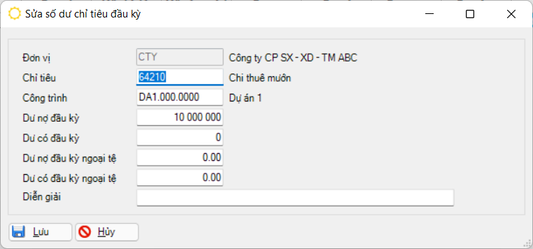 Màn hình cập nhật chi tiết số dư chỉ tiêu đầu kỳ