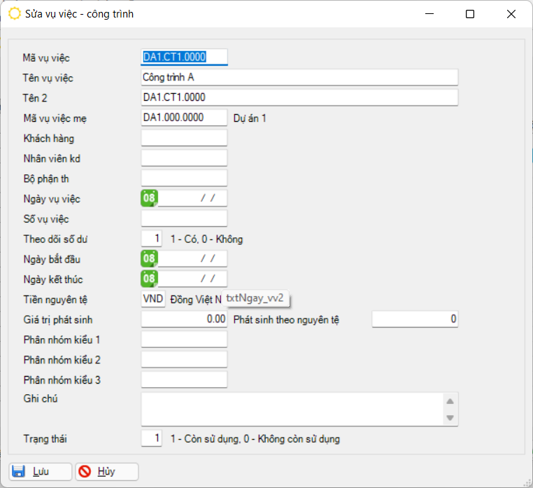 Mã khách hàng, mã nhân viên kinh doanh và mã bộ phận thực hiện hợp đồng.Các mã này được lấy từ các danh mục tương ứng, là thông tin tham khảo thêm.