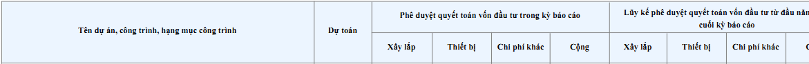 Với báo cáo quyết toán, các hạng mục này được thể hiện thành cột, và lần lượt được chứa trong các cột: