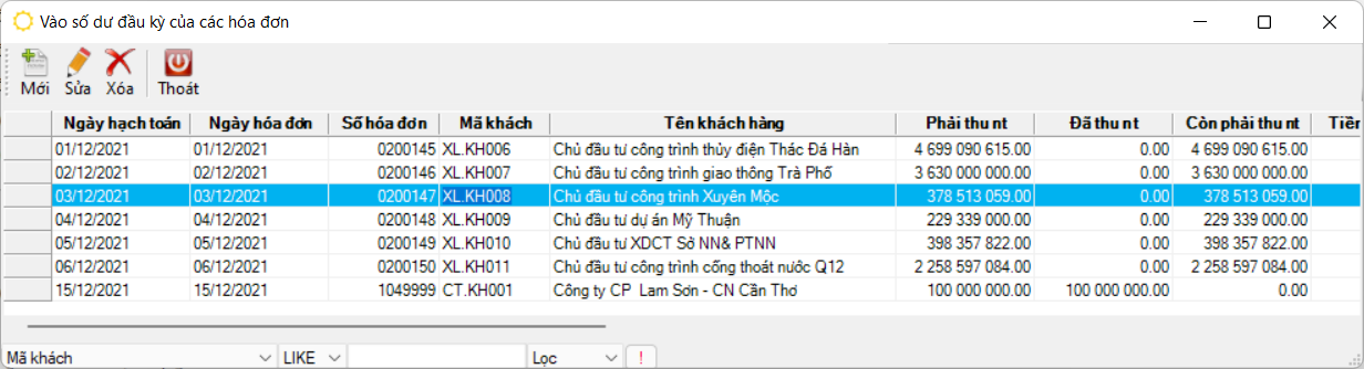 - “Sửa” để sửa hóa đơn công nợ đầu kỳ của một khách hàng.