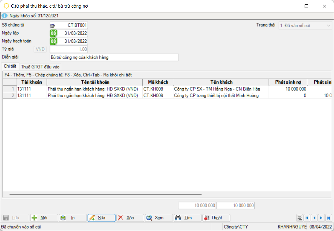 Màn hình cập nhật chứng từ phải thu khác, chứng từ bù trừ công nợ