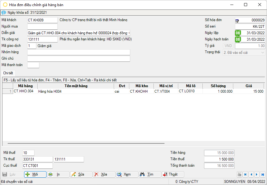 Trường hợp hóa đơn xuất cho khách hàng ghi số tiền lớn hơn số tiền hàng hóa thực giao và đơn vị mua hàng yêu cầu xuất hóa đơn điều chỉnh thì chứng từ này cũng được cập nhật tại chức năng này.