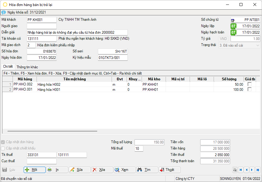 Một số thao tác cơ bản khi lập hóa đơn hàng bán bị trả lại