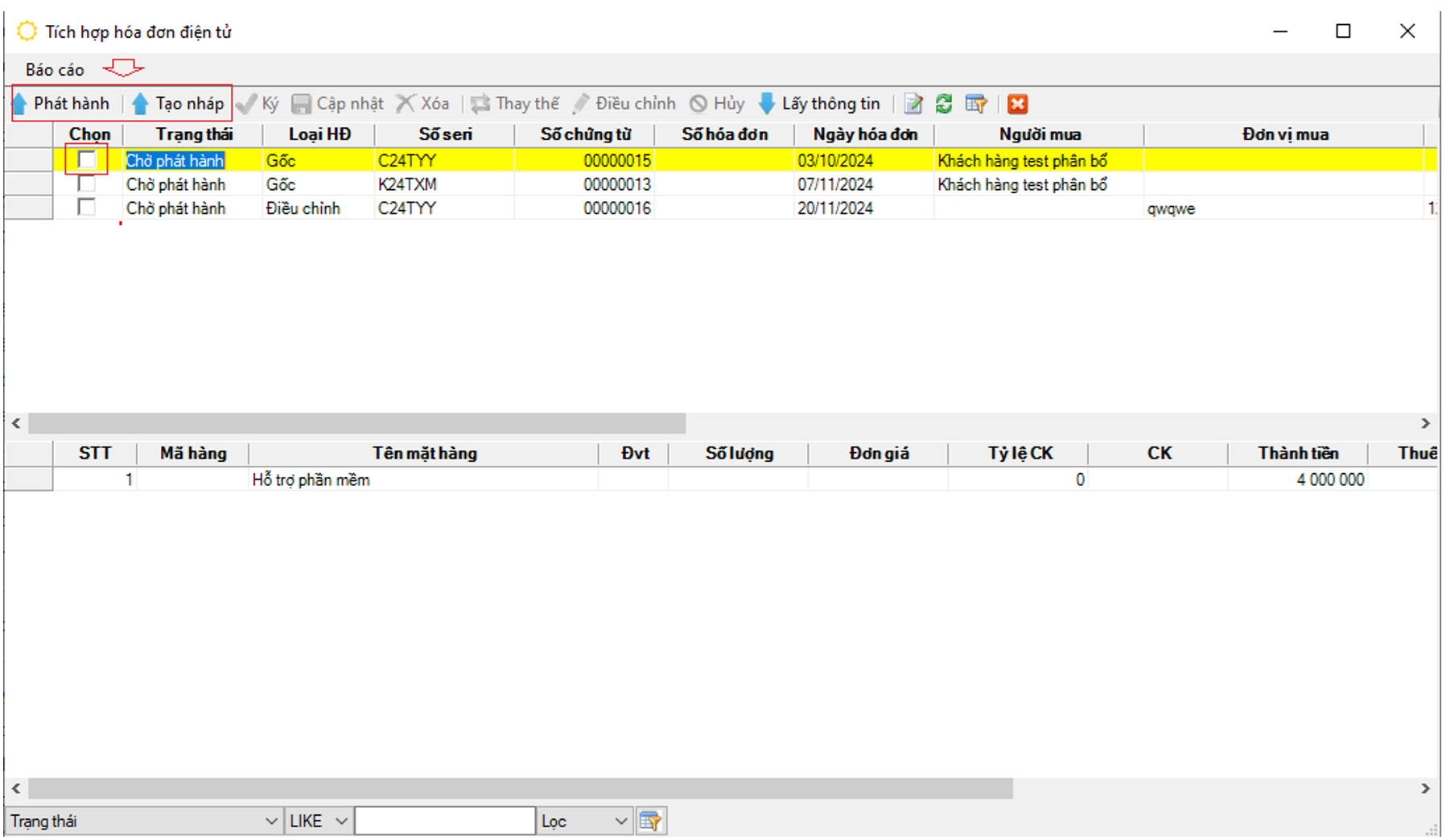 - Trạng thái: 0 - Chờ phát hành