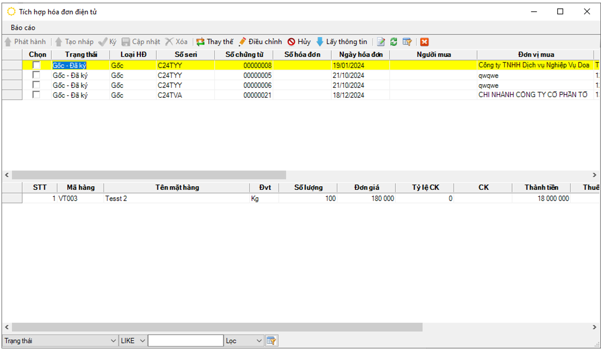 - Nếu điều kiện lọc là hóa đơn “Thay thế - đã ký” thì người dùng có thể lựa chọn “Thay thế” hoặc “Hủy” chứ ko điều chỉnh được