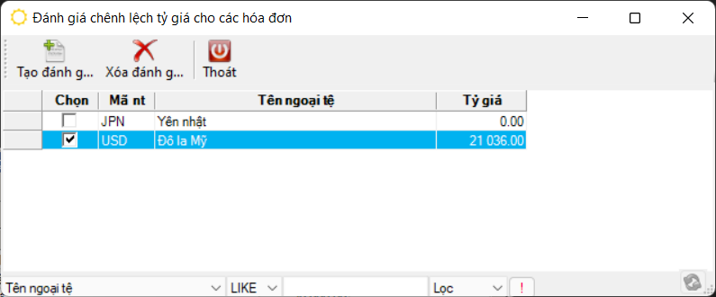 Trước khi tạo bút toán chênh lệch tỷ giá, ta phải chọn ngoại tệ nào sẽ được đánh giá trong kỳ và nhập tỷ giá cuối kỳ để đánh giá.