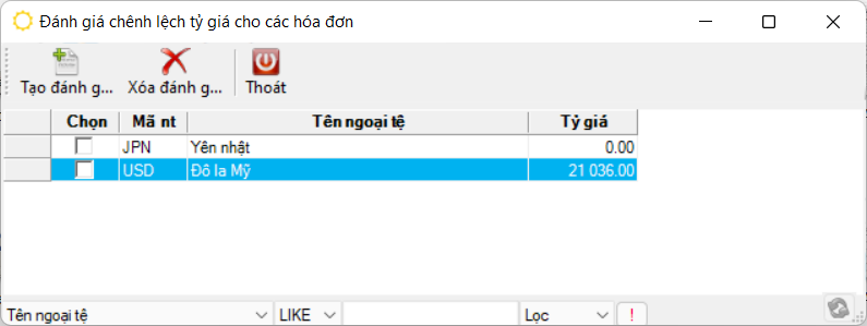 Cách thực hiện tương tự như chức năng đánh giá chênh lệch tỷ giá cuối kỳ của cuối kỳ trước của hoá đơn.