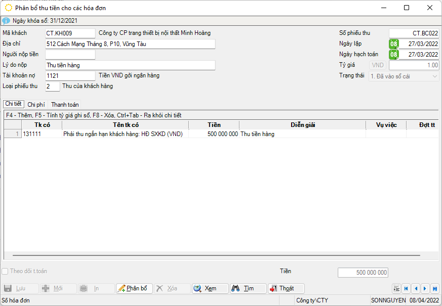 Chức năng này dùng để phân bổ số tiền đã thu khách hàng cho các hoá đơn mua hàng. Màn hình phân bổ chỉ hiện lên các phiếu thu, giấy báo có mã giao dịch=2, 5 để phân bổ.