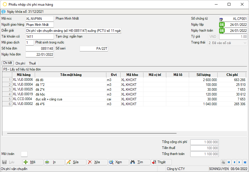 Lưu ý là tổng số tiền theo các loại phí đã được phân bổ vừa đủ cho các chi tiết theo mặc nhiên. Trong trường hợp sửa lại, cũng phải bảo đảm yêu cầu này, nếu không chương trình sẽ thông báo “Tiền chi phí không đúng hoặc chưa phân bổ”.
