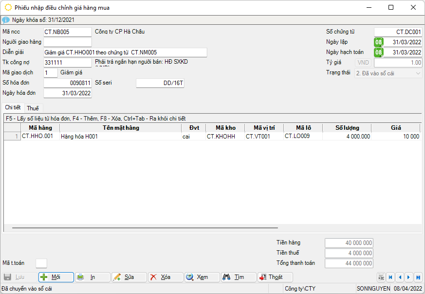 Chi tiết các thao tác làm việc với chứng từ đề nghị xem thêm “Những hướng dẫn chung về cập nhật các chứng từ”