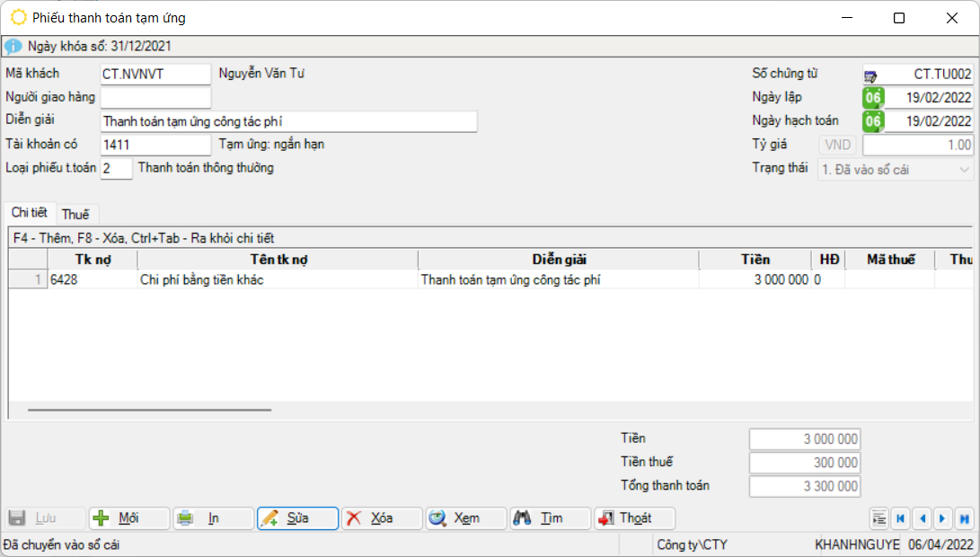 Chi tiết các thao tác làm việc với chứng từ đề nghị xem thêm “Những hướng dẫn chung về cập nhật các chứng từ”