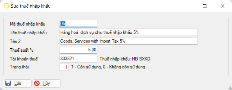 Mã thuế Mã thuế nhập khẩu, gõ tự do, tối đa 8 ký tự. Tên thuế Mô tả nội dung thuế, gõ tự do, tối đa 128 ký tự. Tên 2 Tên mô tả bằng tiếng Anh của mã thuế. Thuế suất % Thuế suất thuế nhập khẩu Tài khoản thuế (Tk thuế) Tài khoản hạch toán của mã thuế này, lấy từ Hệ thống tài khoản. Tài khoản thuế được hạch toán tự động trong phiếu nhập hàng nhập khẩu. Trạng thái Trạng thái sử dụng của mã thuế này, chọn 01 trong 02 trạng thái: 1 – Còn sử dụng, 0 – Không còn sử dụng.