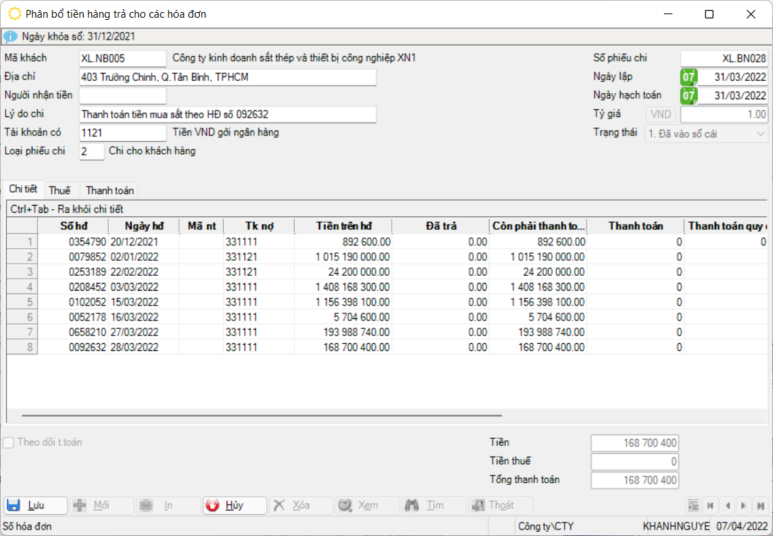 Phân bổ tiền hàng trả cho các hóa đơn