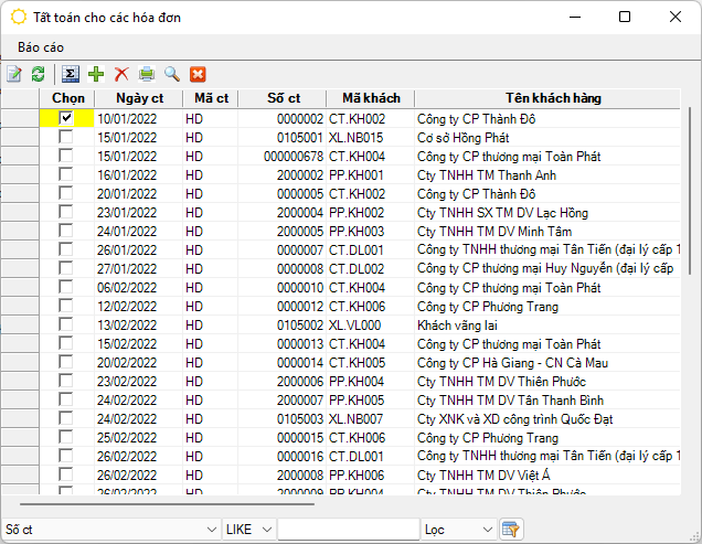 Chọn Chứng từ được chọn để xử lý tất toán Ngày ct, Mã ct, Số ct, Mã khách, Tên khách, Tài khoản Các thông tin chung về chứng từ hóa đơn Số tiền Số tiền tổng thanh toán trên hóa đơn Đã thu Số đã được thu (thanh toán) đến ngày cuối của kỳ, năm trên màn hình lọc Phải thu Số tiền còn phải thu. Số phải thu này có thể âm ( - ) hoặc dương (+) tùy trường hợp thu thừa hoặc thu thiếu. Hạn thanh toán, Ngày thanh toán Thời hạn thanh toán, ngày đến hạn phải thu của hóa đơn