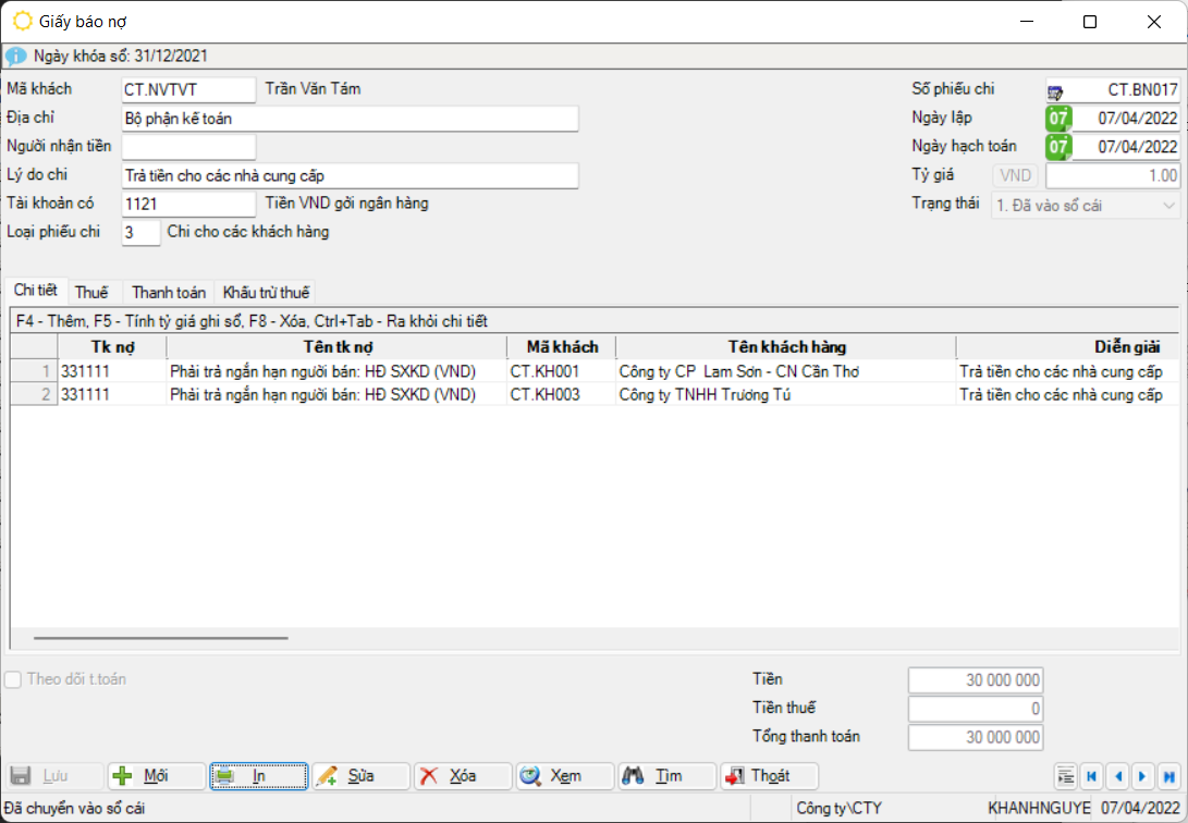 Trường hợp chi cho nhiều khách cũng giống như trường hợp loại giấy báo nợ cho một khách. Điểm khác biệt ở đây là ở mỗi dòng chi tiết hạch toán có thể nhập các mã khách khác nhau. Ngoài ra, đối với các phát sinh ngoại tệ mà dùng mã giao dịch này thì chương trình chỉ ghi nhận và hạch toán theo tỷ giá giao dịch, không tạo chênh lệch tỷ giá.