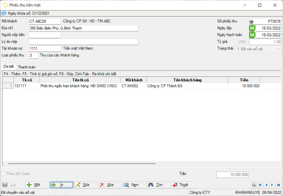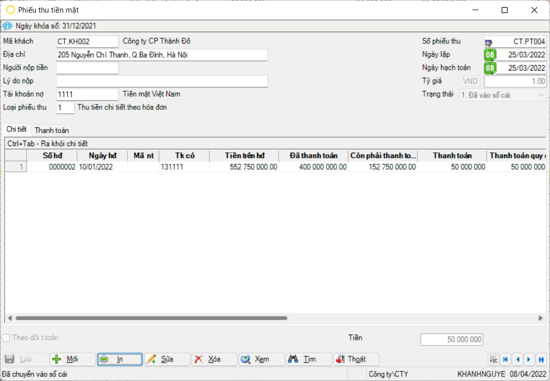 Trong trường hợp phiếu thu mã giao dich 2, tỷ giá trong chi tiết sẽ là tỷ giá ghi sổ của tài khoản công nợ. Tỷ giá ghi sổ của tài khoản công nợ sẽ được chương trình tính tự động.