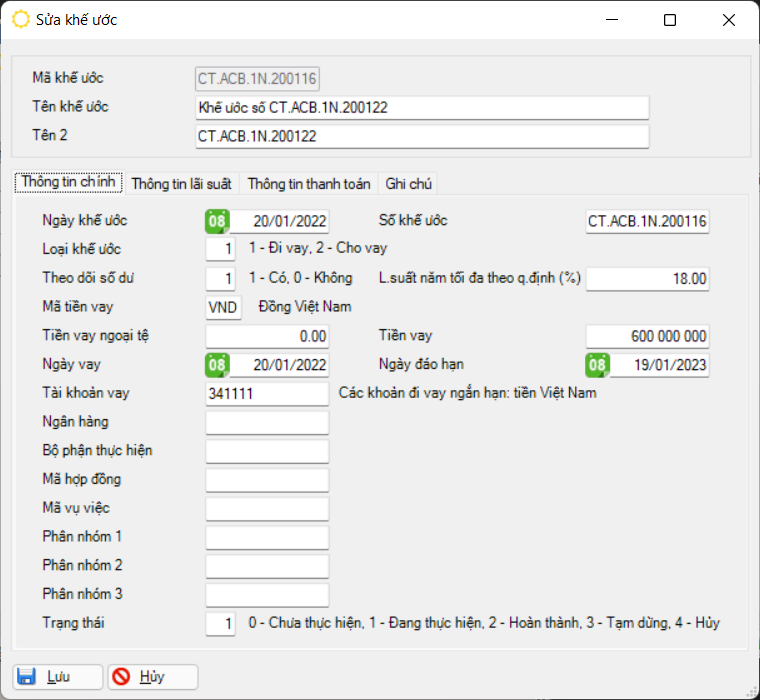 Tài khoản vay và ngân hàng cho vay. Trường “Ngân hàng” được tham chiếu trong danh mục khách hàng. Tài khoản vay phải là tài khoản chi tiết được lấy trong danh mục tài khoản.