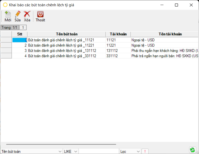 Đường dẫn: Tổng hợp → Khai báo các bút toán tự động → Khai báo các bút toán đánh giá chênh lệch tỷ giá