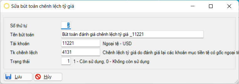 Số thứ tự của các bút toán chênh lệch tỷ giá. Các bút toán chênh lệch tỷ giá được chương trình thực hiện tuần tự theo thứ tự này.