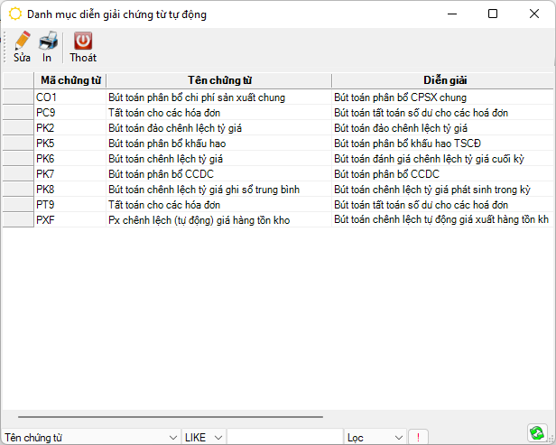 Danh mục diễn giải chứng từ tự động được dùng để khai báo diễn giải muốn thể hiện với các mã chứng từ mang tính thủ tục, không được nhập bởi người dùng mà do chương trình tự sinh ra trong các quy trình xử lý.
