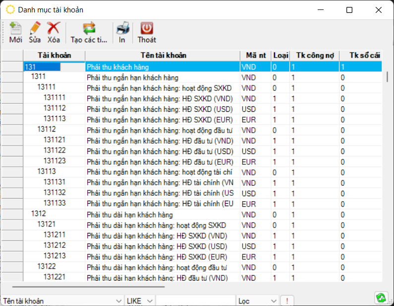 Đường dẫn: Tổng hợp → Danh mục tài khoản