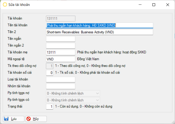 Giải thích các trường trên màn hình thêm mới, sửa danh mục tài khoản