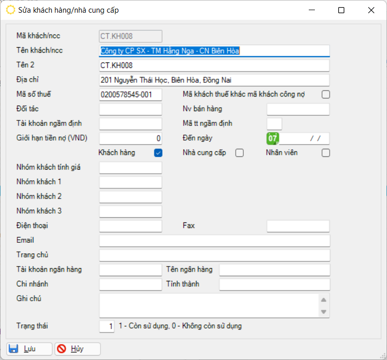 Trạng thái sử dụng của mã khách hàng/ nhà cung cấp này, chọn 1 trong 2 trạng thái: 1 – Còn sử dụng, 0 – Không còn sử dụng