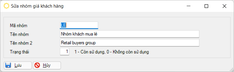 Mã nhóm Dùng để khai báo khách hàng thuộc nhóm giá nào. Tương ứng mỗi nhóm giá sẽ có các mức chiết khấu khác nhau tùy theo khai báo trong phần cập nhật thông tin chiết khấu. Tên nhóm / Tên nhóm 2 Mô tả tên nhóm giá của khách hàng. Tên nhóm 2 là tên tiếng Anh của nhóm. Trạng thái Trạng thái sử dụng mã nhóm giá này, chọn 01 trong 02 trạng thái: 1– Còn sử dụng, 0 – Không còn sử dụng.