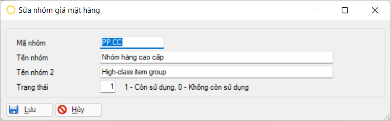 Mã nhóm Mã nhóm giá vật tư. Dùng để khai báo trong danh mục vật tư cho biết vật tư thuộc nhóm giá nào. Tương ứng mỗi nhóm giá sẽ có các mức chiết khấu khác nhau tùy theo khai báo trong phần cập nhật thông tin chiết khấu. Tên nhóm / Tên nhóm 2 Mô tả tên nhóm giá của vật tư. Tên nhóm 2 là tên tiếng Anh của nhóm. Trạng thái Trạng thái sử dụng mã nhóm giá này, chọn 01 trong 02 trạng thái: 1– Còn sử dụng, 0 – Không còn sử dụng.