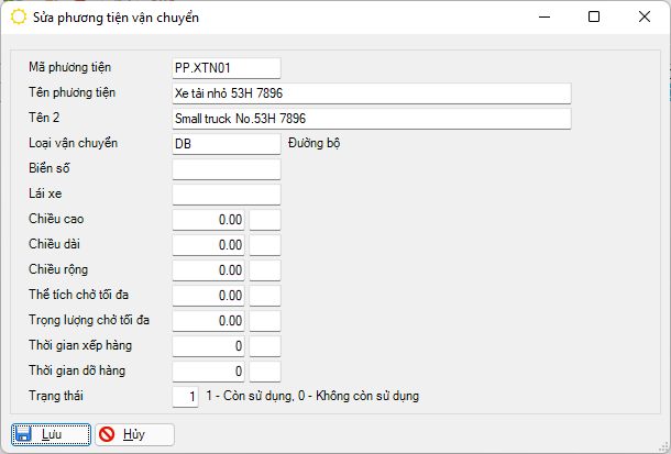 Mã phương tiện Mã của phương tiện vận chuyển Tên phương tiện / Tên 2 / Người điều khiển phương tiện Tên gọi, tên gọi tiếng Anh và Người phụ trách điều khiển của phương tiện Loại vận chuyển của phương tiện Thông tin cho biết phương tiện thuộc loại hình vận chuyển nào, lấy từ danh mục loại vận chuyển Chiều cao/ dài / rộng / thể tích tối đa / trọng lượng tối đa Các thông số kỹ thuật của phương tiện để tham khảo thêm trong khi phân bổ chuyến hàng. Thời gian xếp hàng / dỡ hàng tối đa của phương tiện Các thông số về thời gian thao tác liên quan đến phương tiện để tham khảo thêm trong khi phân bổ chuyến hàng. Trạng thái Trạng thái sử dụng của mã phương tiện này, chọn 01 trong 02 trạng thái: 1 – Còn sử dụng, 0 – Không còn sử dụng