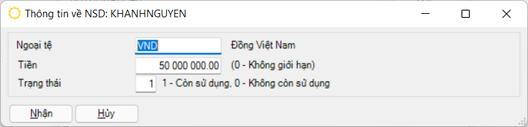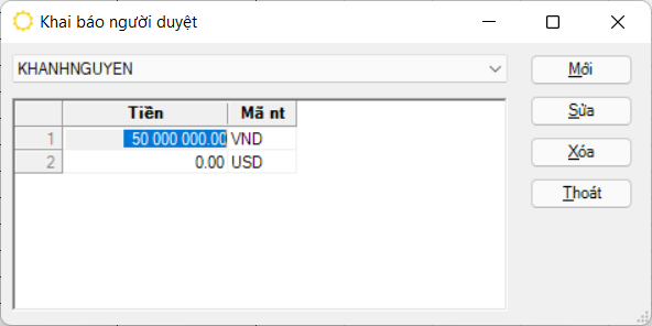 Ngoại tệ Mã ngoại tệ lấy từ Danh mục tiền tệ. Tiền Tổng số tiền mà người sử dụng có quyền duyệt, nếu không khai báo (số tiền là 0) có nghĩa là không hạn chế số tiền duyệt. Trạng thái Trạng thái còn sử dụng hay không của phân quyền này.
