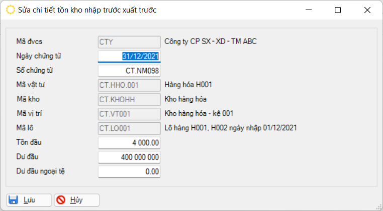 Đối với các vật tư tính giá tồn kho theo phương pháp nhập trước xuất trước, ta phải khai báo số tồn đầu (về số lượng và giá trị) của từng phiếu nhập còn tồn.