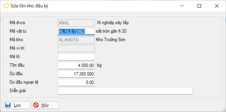 Màn hình nhập liệu số tồn kho đầu kỳ các vật tư